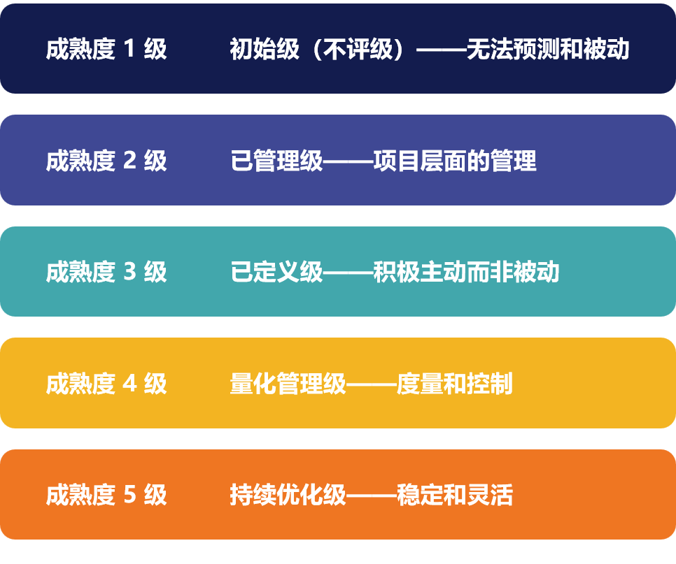 4. 评估时长视具体评估进展情况确定,CMMI 2级和CMMI 3级一般为5天及以上,CMMI 4级和CMMI 5级一般为7天及以上。